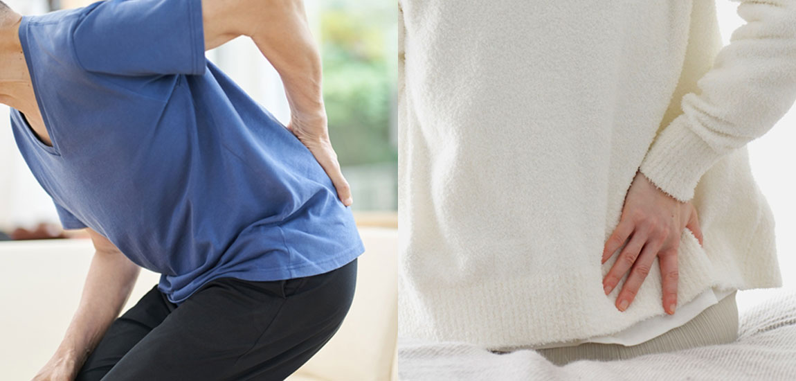 腰痛の原因は多岐にわたりますが、大きく分けて筋肉や骨の障害、内臓の病気、精神的不調、神経障害、姿勢の悪さなどが考えられます。 腰痛の15%は原因を特定できる「特異的腰痛」です。原因となる代表的な病気としては椎間板ヘルニア、高齢者に多い腰部脊柱管狭窄症、骨粗しょう症が挙げられます。これらはいずれも背骨の神経(脊髄神経根)が圧迫されて痛みが起こり、圧迫がひどいときには、脚の筋力低下やしびれを伴います。 腰痛の約85%は、神経症状(しびれやまひなど)や重い基礎疾患などがなく、エックス線やMRIなどの画像検査をしても、どこが痛みの原因なのか特定しきれない「非特異的腰痛」です。いわゆる腰痛症と呼ばれるものはこれにあたります。長時間中腰や猫背などの姿勢を続け、腰や背中の筋肉が緊張し続けたときや、運動不足で腰を支える筋力が弱っているときなどに起こります。寒さで筋肉が硬直する冬も神経が刺激されて痛みが起こりやすくなります。通常は、セルフケアをしていれば短期間で軽くなりますが、休養が十分とれなかったり、ストレスなどの心理的要因があると長期化することもあります。 急性の腰痛であるいわゆるぎっくり腰も非特異的腰痛に含まれます。急に無理な動作をしたときなどに起こる腰の組織のけがで、ねんざや、椎間板、腱、靭帯などの損傷が多いと考えられていますが、厳密にどの部分が傷んでいるのかを断定するのは難しいためです。